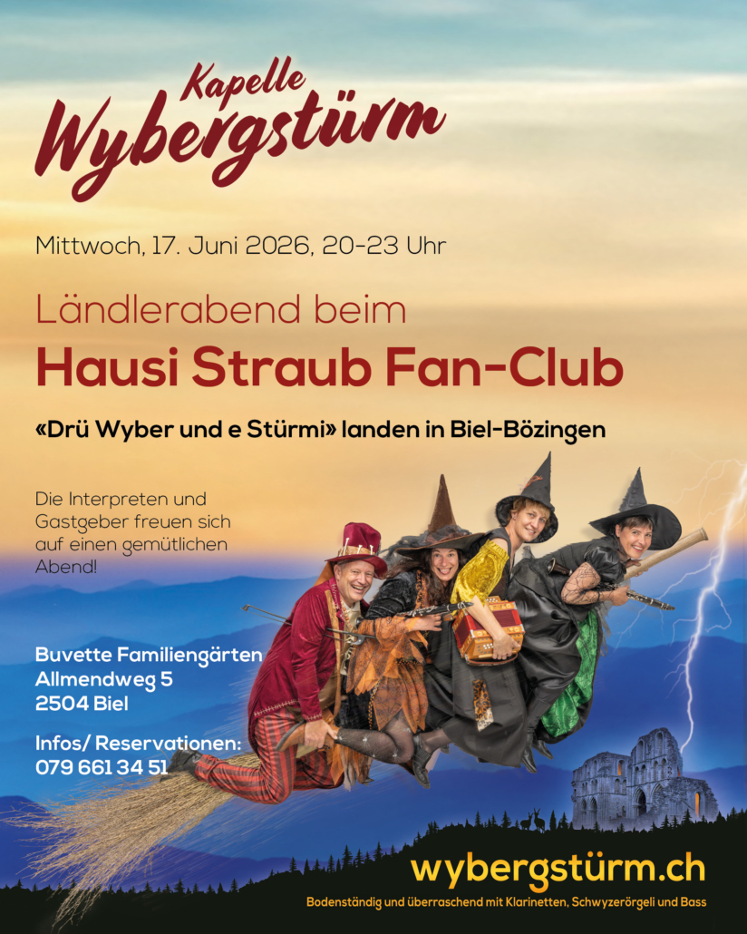Datum 17 Juni 2026 Uhrzeit 20:00 - 23:00 Wybergstürm beim Hausi Straub Fan-Club Biel BE Wir freuen uns, erneut in Biel aufspielen zu dürfen: Hausi Straub Fan-Club Allmendweg 5 2504 Biel Telefon 079 661 34 51 Teile diese Veranstaltung + Zu Google Kalender hinzufügen + iCal / Outlook export